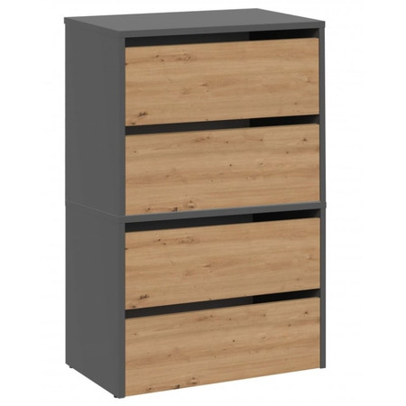 Botník MODO X2- antracit / dub artisan. Pohodlný botník MODO X2, ideální do předsíně. Pečlivé zpracování, elegantní vzhled a originální barva dodají vaší předsíni nový lesk. Náš botník je vyroben z 16mm otěruvzdorné laminované desky. Výklopná dvířka zajištují funkčnost skříně. Za dvířky jsou 4 prostorné police na boty. Údržba: Očistěte povrch nábytku měkkým hadříkem. Vyhněte se používání silných chemikálií.