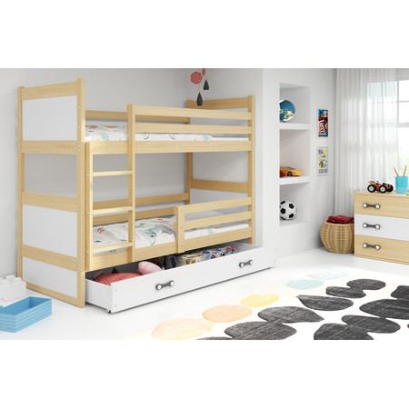 Dětská patrová postel RICO 200x90 cm. Postel je vyrobena z masivní borovice. Díky praktickému úložnému prostoru vyřešíte problémy s uschováním všech malých nezbytností. S ohledem na děti je veškerý sortiment vyroben z ekologicky nezávadného materiálu. Žebřík lze namontovat vpravo i vlevo. - 100% ochrana pro vaše dítě díky bezpečnostní zábraně - rošty jsou vyrobené ze dřeva - úložný prostor Pěnové matrace, které jsou vysoce hypoalergenní s lehce snímatelným potahem, který lze prát v pračce. Matrace je univerzální, vzdušná a velmi dobře odvádí vlhkost. Výška matrace je 7 cm. Údržba: Povrch nábytku utřete do čista měkkým hadříkem. Vyhněte se použití chemikálií.