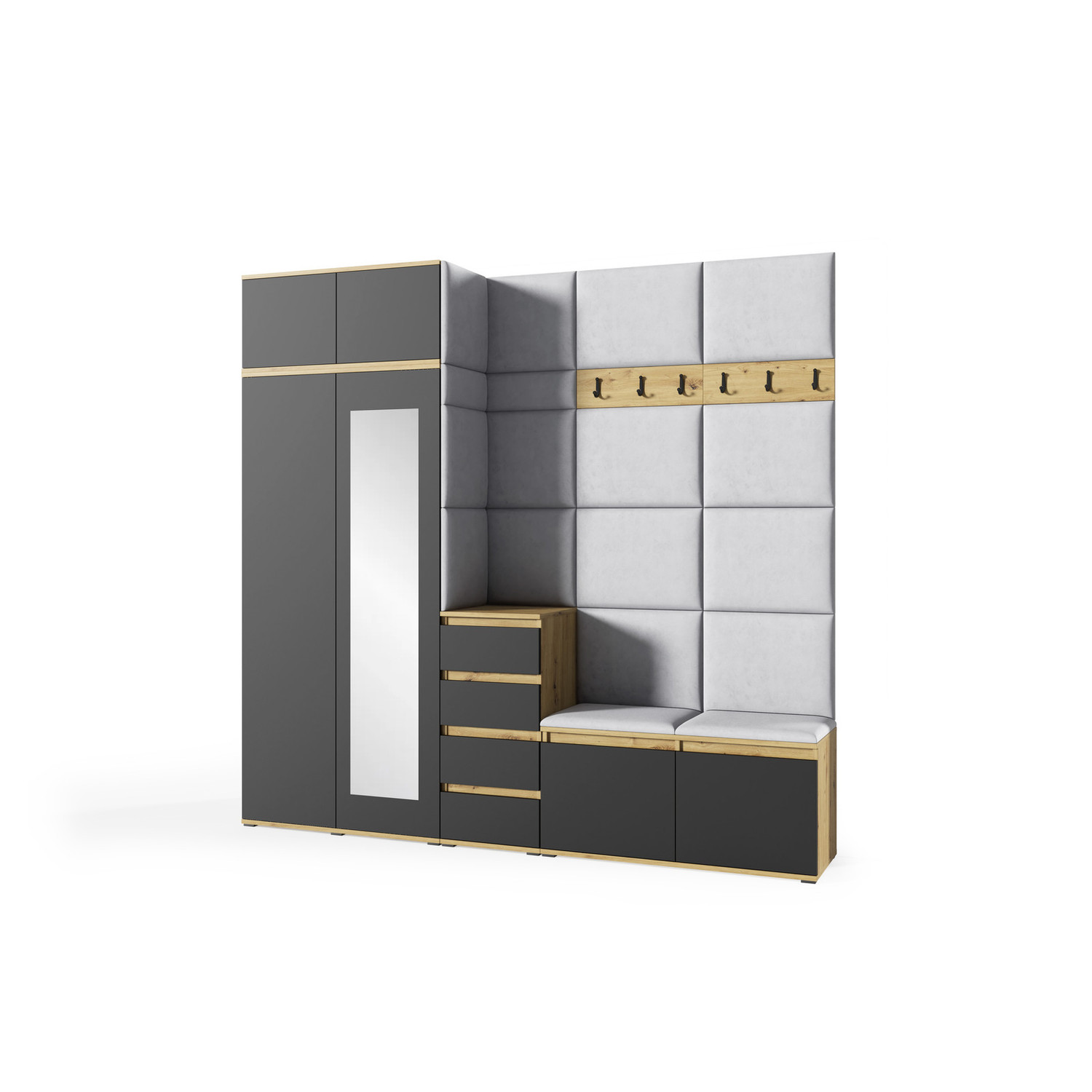 Předsíňová stěna AMI 33 se zrcadlem. Je to praktický prvek do vstupních prostor vašeho domu. Předsíňová stěna obsahuje čalouněné panely, které se montují přímo na stěnu za pomoci lepidla. Potah panelů je tkanina Trinity. Předsíňová stěna se skládá z několika částí. - kvalitní zpracování - panely - potaženy kvalitní látkou Trinity - Je to měkká a na dotek příjemná velurová tkanina. Má jemnou strukturu. Jejím charakteristickým znakem je vysoká odolnost vůči oděru. - lepidlo není součástí balení Údržba: Povrch nábytku utřete do čista měkkým hadříkem. Vyhněte se použití chemikálií.