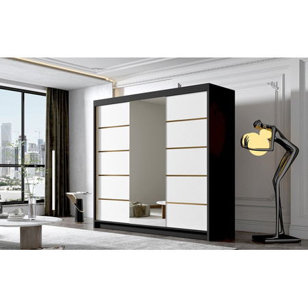 Šatní skříň EVO VI 200 cm - černá/bílá. Posuvná šatní skříň EVO VI kombinuje klasickou jednoduchost a moderní design. Zrcadlo umístěné na dveřích dodává své jedinečné kouzlo. Je ideální jako šatní skříň do předsíně nebo místo pro uložení oblečení v ložnici nebo jiných drobností každodenní potřeby. - použití kvalitních materiálů - zajímavé provedení - snadná montáž - hliníkové lišty podél dveří - ozdobné lišty ve zlaté barvě Údržba: Povrch nábytku utřete do čista měkkým hadříkem. Vyhněte se použití chemikálií.